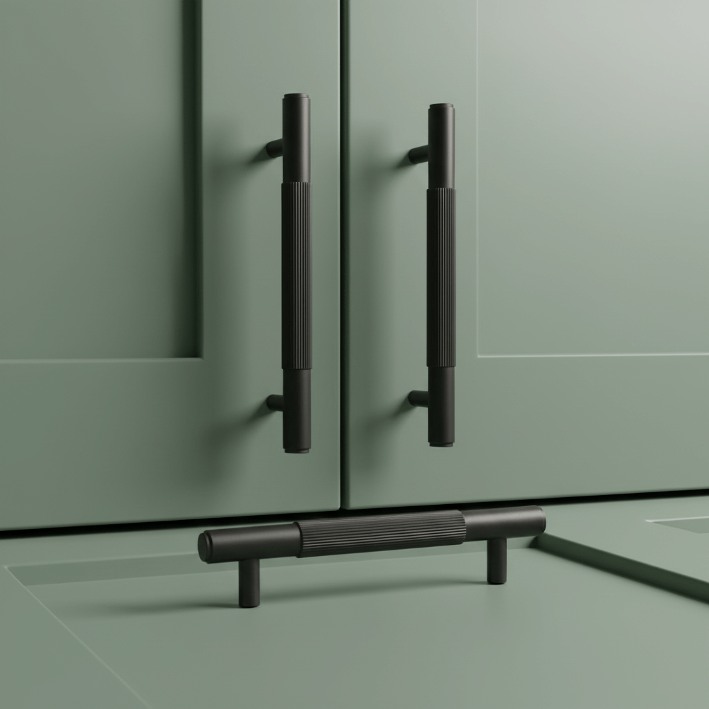 Poignée noire en laiton massif avec surface cannelée. Une poignée moderne et l'une de nos meilleures ventes en magasin. Elle convient aussi bien aux portes de cuisine qu'aux commodes de salle de bains ou aux meubles. Son poids conséquent combiné aux détails cannelés ne passe pas inaperçu. Une poignée haut de gamme pour ceux qui apprécient la richesse des détails et la qualité.